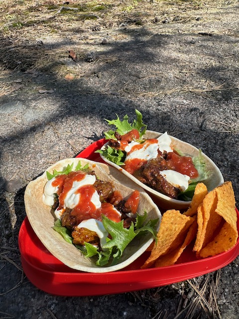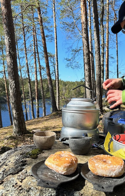 Saavuimme Kämmenlammen laavulle ja siellä meitä odotti retkiseurueen kanssa iloinen suomenpystykorva, jota tervehdimme. Kämmenlampi on sympaattinen pieni suolampi, jonka rannassa on laituri ja uimareille uimatikkaat. Paikalla on myös laavu ja tulipaikka. Puuliiteri näytti olevan tyhjä. Kapusimme läheiselle kalliolle lounaan tekoa varten. Kuten minun retkilläni on tapana, lounas oli suunniteltu nuotion sijaan retkikeittimellä tehtäväksi. Vappumenu sisälsi tällä kertaa chilihärkiksellä täytettyjä tortillaveneitä salaatin kera. Olemme kuluvan vuoden aikana vähentäneet lihan syöntiä ja tutustuneet kasvipohjaisiin proteiinin lähteisiin ja tämä kyseinen tuote oli oikein hyvä valinta. Tämän retkiruuan valmistamiseen ei tarvinnut juurikaan varata vettä, ainoastaan pannun huuhtelua varten.