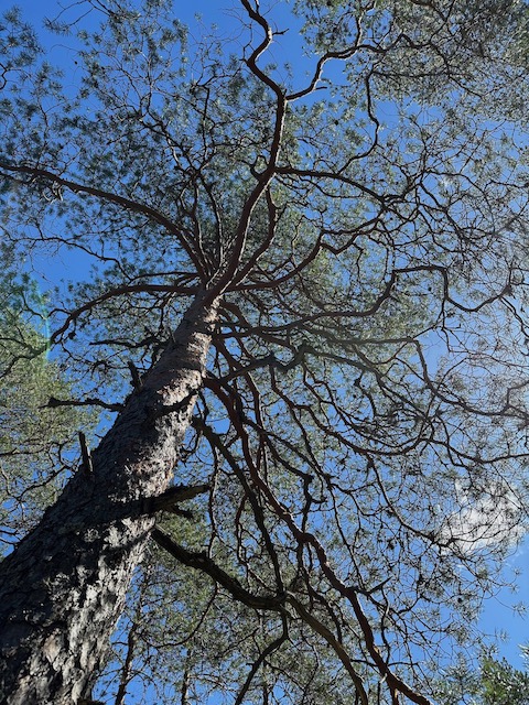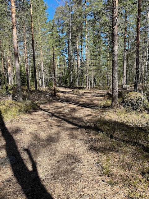 Olin etukäteen tutustunut alueeseen Nuuksion paperikartan avulla. Sieltä bongasin Kämmenlammen laavun, jolle olisi sopiva kävelymatka ja joka voisi olla hyvä lounaspaikka. Takaisin voisimme kävellä hieman eri reittiä ja pysähtyä kahville näköalapaikalle, joka oli merkitty karttaan. Paperikartan lisäksi apuna oli Komoot-sovellus, jonka asetin tallentamaan reitin, jotta näkisin, missä olemme seikkailleet. Reitti alkoi parkkipaikalta melko tyypillisenä metsäpolkuna. Hetken kuljettuamme tuli eteen hieman kosteikkoa, mutta selvisimme siitä kuivin jaloin. Polkuja kulki ristiin rastiin, mutta Komootin ja paperikartan avulla etenimme kohti Kämmenlampea. Matkalle osui useampi järvi ja ensimmäisen eteemme avautui Saaren Musta – niminen järvi. Sen vesi näytti tosiaan mustalta. Seurasimme hetken järvessä uiskentelevia sammakoita ja jatkoimme sitten matkaa. Matkan edetessä ihastelimme kauniita maisemia ja tuoksuttelimme talven jäljiltä heräävää luontoa. Muita kulkijoita oli vähän, muutamia siellä täällä, ei ruuhkaksi asti.