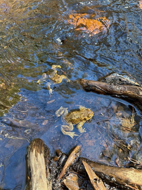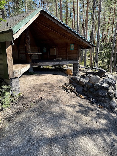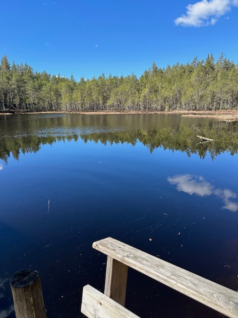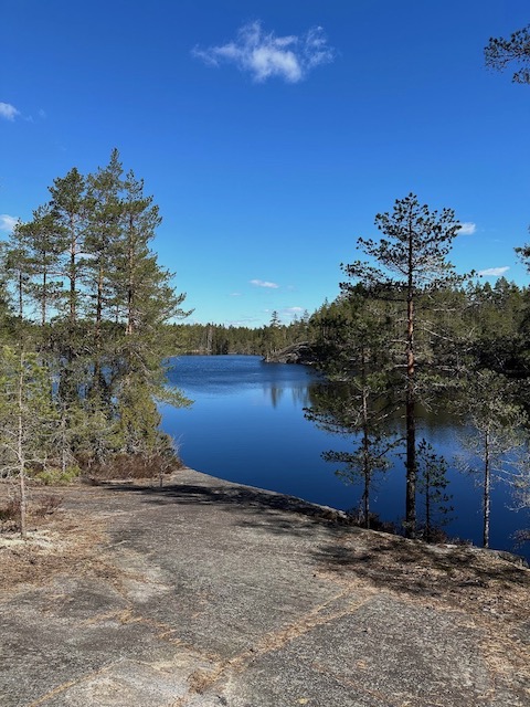 Lounaan jälkeen lähdimme kulkemaan takaisin päin. Kuljimme hetken matkaa merkattua reittiä Reitti 2000, josta löydät lisätietoa vaikka täältä. Päädyimme ja tulomatkalta tutun Saaren Musta-nimisen järven rannalle, mutta vastarannalle. Myös täällä oli sammakoiden kevätuiskentelut meneillään. Löysimme karttaan merkityn näköalapaikka, jossa päätimme kahvitella ja ihastella maisemia.