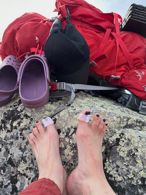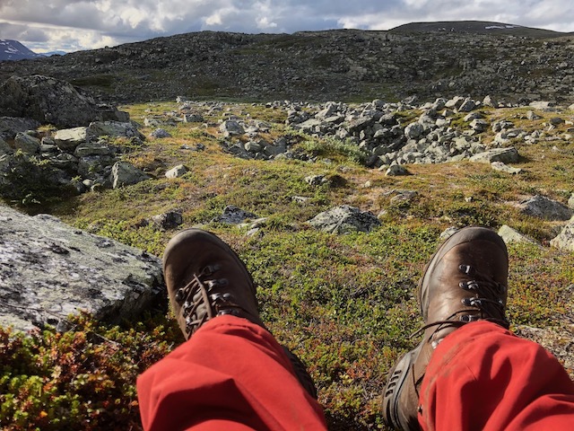 Pitkillä vaelluksilla totuin siihen, että jalat nyt vaan kipeytyvät ja rakkoja tulee vaikka mitä tekisi. Haltin reissun jälkeen jalkateräni olivat pitkään puutuneet ja jalkapöydän luut olivat arkoja etenkin toisessa jalassa. Tulevilla vaelluksilla minulla oli aina nippu rakkolaastareita mukana ja aloin myös teipata ennen reissun alkua ukkovarpaani, sillä se hinkkasi pidemmän kävelyn aikana viereiseen varpaaseen niin, että molempiin tuli rakkulat. Levitin aina huolellisesti rakonestopuikkoa ennen retkeä ja jokaisella pidemmällä tauolla. Tauoilla otin aina kengät pois, tutkin jalat ja teippasin mahdolliset rakot ja vaihdoin kuivat sukat, sillä jalat hikoilivat paljon raskaissa kengissä, joissa oli Goretex-kalvo. Jalkapöydät kipeytyivät aina pidemmillä vaelluksilla ja niitä piti hieroa aina tauoilla ja leiriin päästyä. Ajattelin tämän kaiken kuuluvan asiaan.