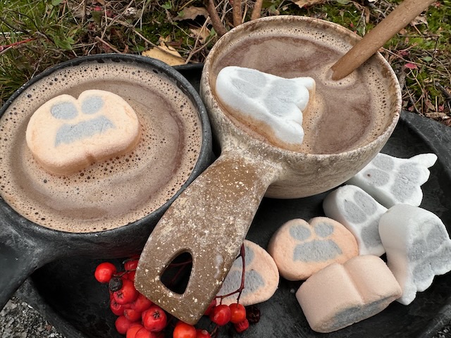 - Retkellä laita kuppeihin suklaapalat, kaakao ja sokeri.